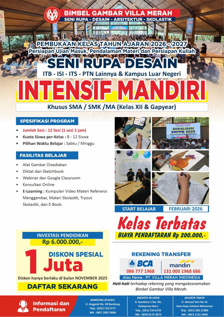 Program kelas Khusus XII SMA untuk mempersiapkan diri menghadapi Seleksi Mandiri Fakultas Seni Rupa Desain ITB atau Perguruan Tinggi lainnya.